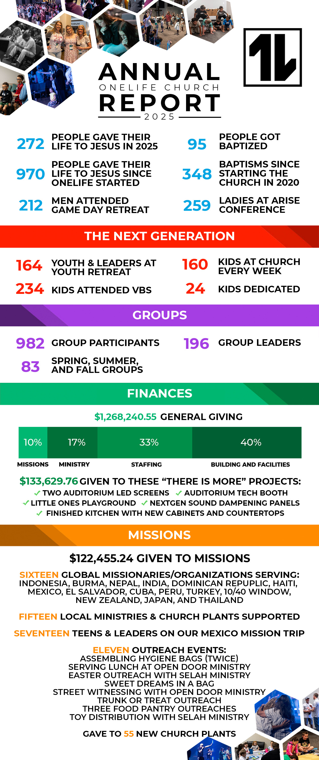 Details: God has done so many incredible things at OneLife Church this past year. Although we are not a church who cares about numbers, each of these numbers represents a person whose life was touched by God, and that is the most important thing at OneLife!