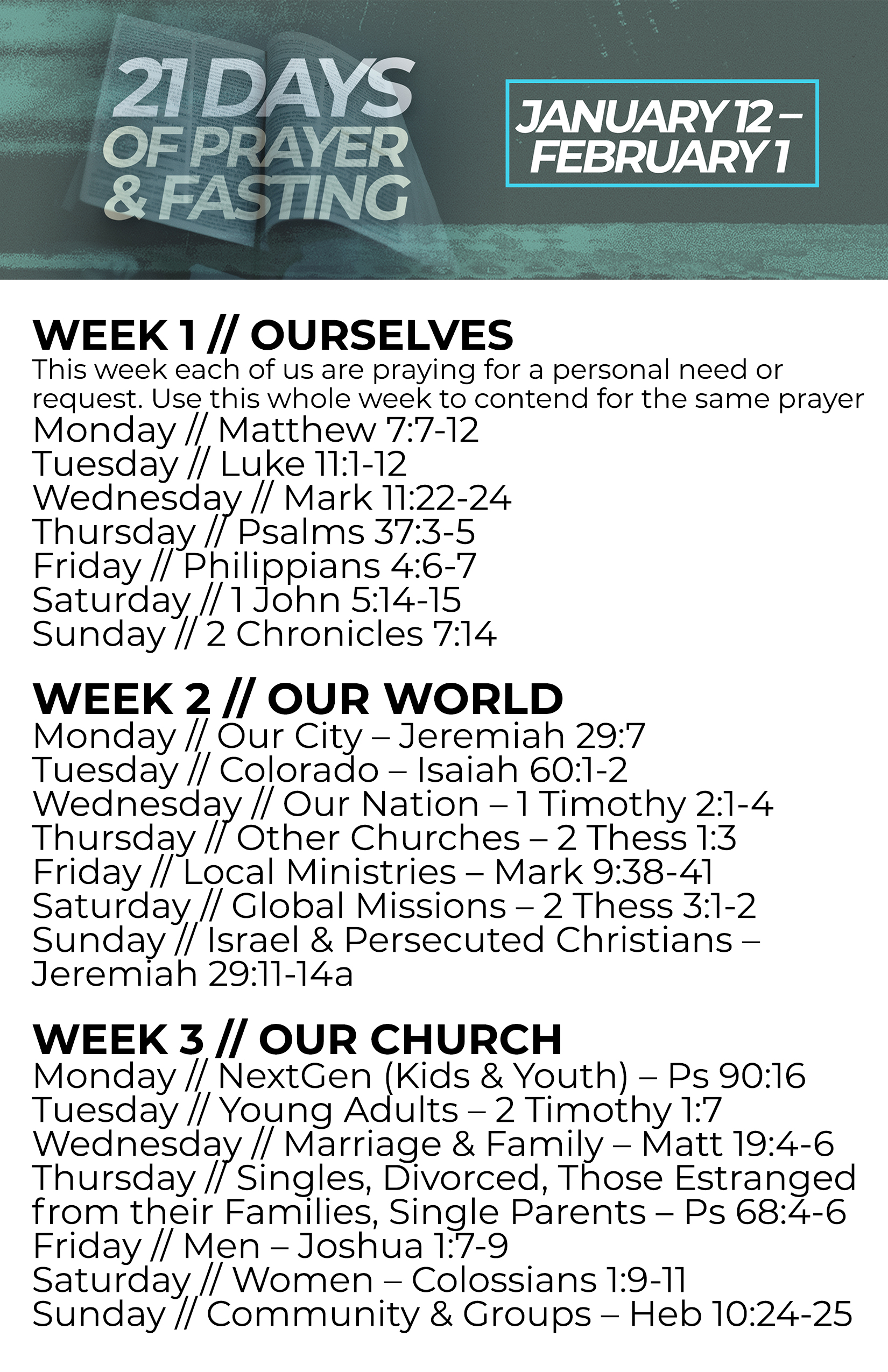 Details: Join us in the new year as we fast and pray. Come to one of our weekly prayer sets on Tuesday nights from 6:30-7:30p, Thursday mornings from 8-9a, and Sunday mornings from 8-8:30a. To receive daily texts with the prayer focuses, text "FAST" to 720-743-6380.